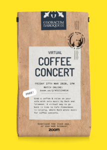 Find out more »This concert was live streamed via Zoom on Friday 27th March at 1pm. Grab a coffee and relax on your sofa with solo music by Bach and Telemann. Featuring Recorder, Violin, Cello and Oboe. A virtual way to go back in time to Cafe Zimmermann in Leipzig, where Bach wrote music for coffee concerts. Zoom is available to download as an app on phones, tablets and computers or it can be watched in a browser. Free entry - donation to…